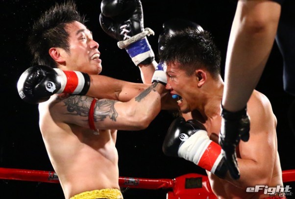 昨年4月、MuayThaiOpenウェルター級王座の3度目の防衛に成功した喜入(右)