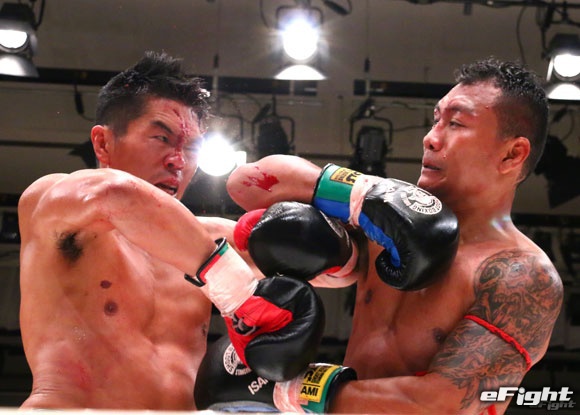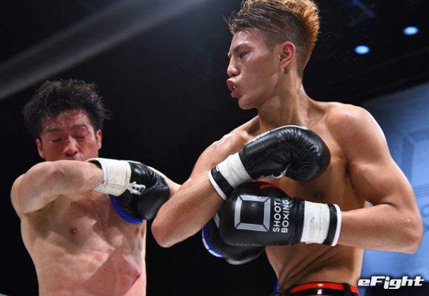 宍戸(左)との試合ではヒジで圧巻のKOを見せたジャオウェハー