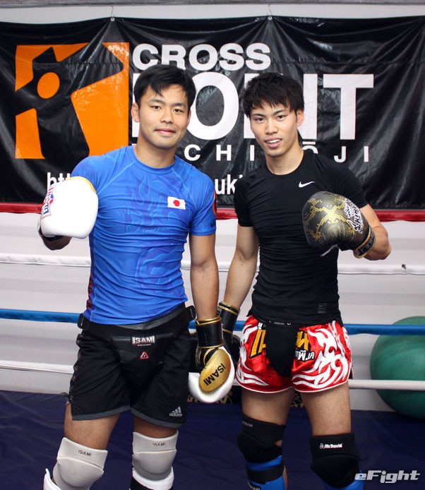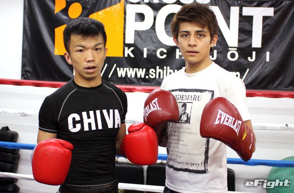 同門の後輩・鈴木宙樹(右)とのスパーを披露した炎出丸(左)