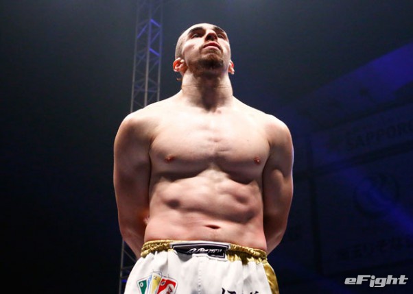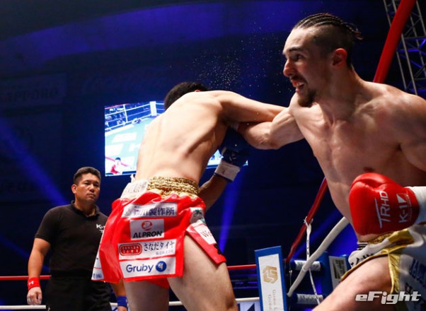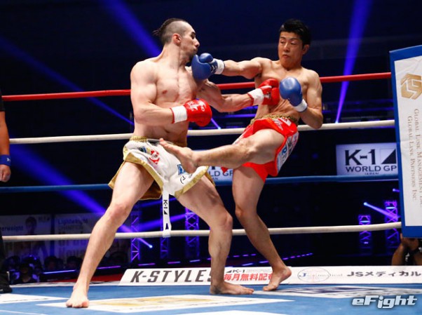 一撃必倒といえるほどの右フックを山際(左)に叩き込む木村(右)