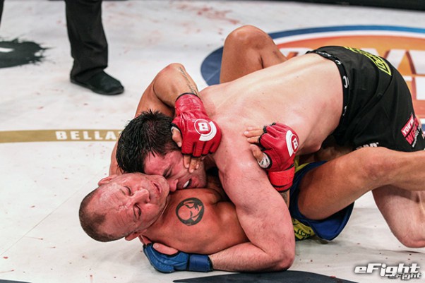 昨年6月のBellator MMAデビュー戦でソネン(上)に終始押さえ込まれ、シウバ(下)は大差の判定で敗れた