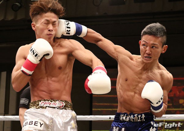 3月、佐藤九里虎(左)を判定で下しRISE初戦を勝利で飾った結城(右)