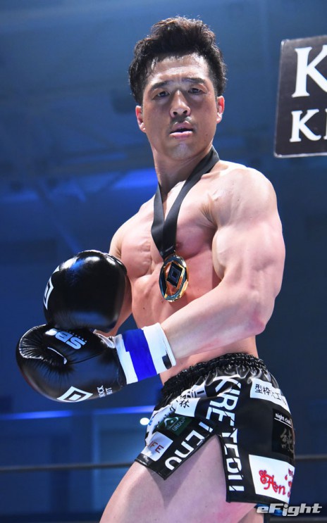 勝利後、恒例のマッスルポーズ撮影をする健太