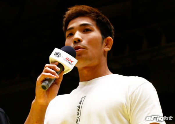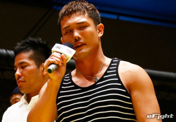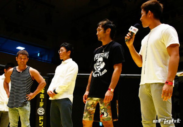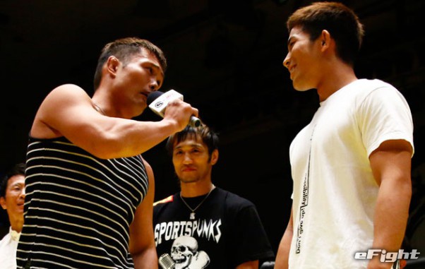 田中(右)の前でしゃがんでメンチを切る大尊(左)