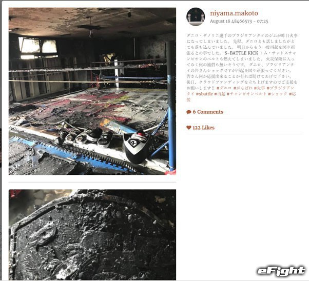 SNSにアップされた焼けてしまったリングと黒焦げになったチャンピオンベルトの写真
