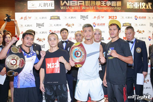 WBA世界ミニマム級王者ノックアウト・CPフレッシュマート(タイ=左)と挑戦者・同級2位の熊朝忠(中国=左から2人目)も計量をクリアー