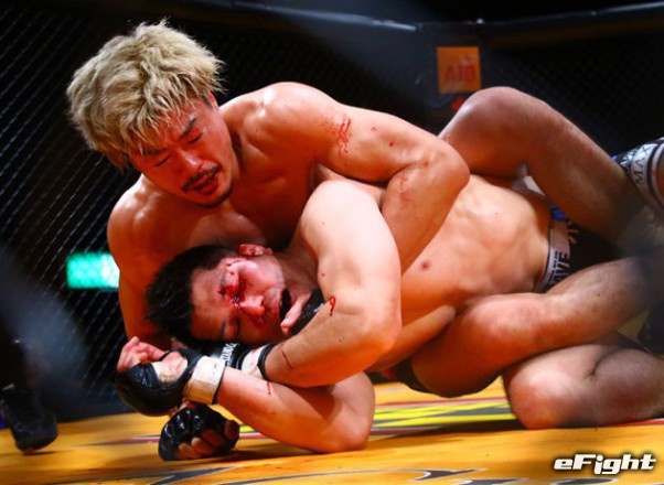 水野(上)は奥野泰舗(下)に一本勝ちを収め、DEEPミドル級王座に就いた