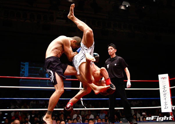 才賀紀左衛門(左)とラウェイ王者・浜本"キャット"雄大(右)の一戦