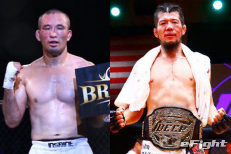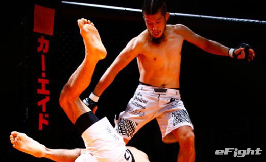 パンチでダウンした相手にパウンドを入れる富樫。柔術黒帯ながら、打撃も得意とする
