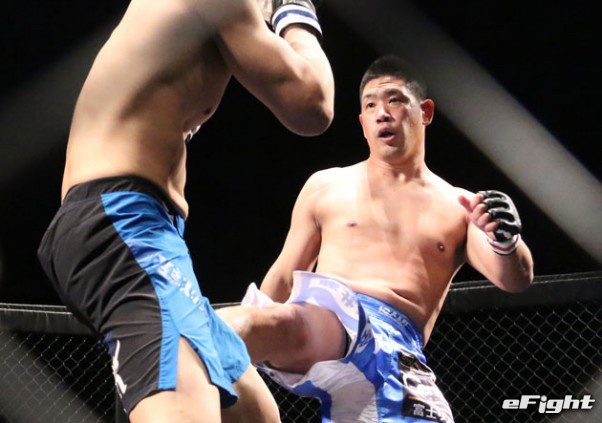 6月の山崎陽一戦でリーチを生かした蹴りを放つMIKE