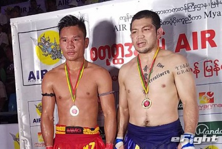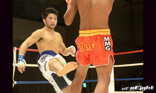 今年6月、ラウェイ重量級トップのムドー(右)をパンチでKOした渡慶次(左)