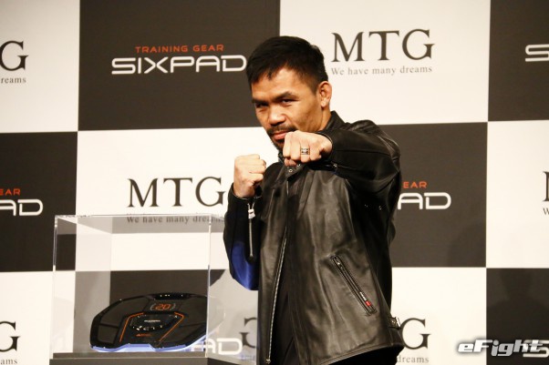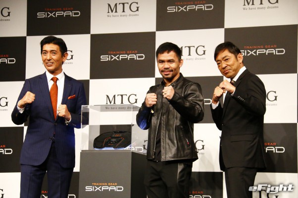 (左から)SIXPADを販売するMTG松下剛代表取締役社長、パッキャオ、香川