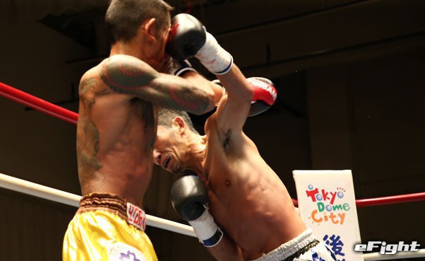 今年5月の試合ではTKO勝ち。左フックをクリーンヒットさせる松崎(右)