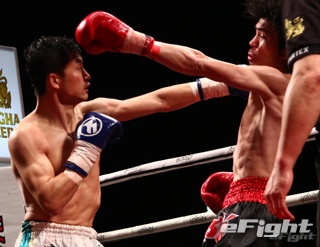 ”キックのカリスマ”立嶋篤史(右)にパンチをクリーンヒットさせる長崎
