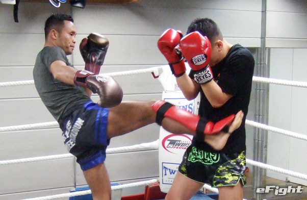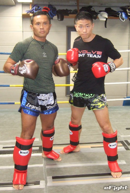 公開練習では得意のパンチに加えて、蹴りもしっかり見せた緑川(左)