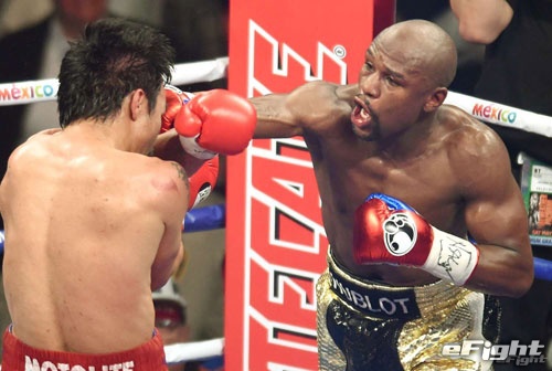 マクレガー(右)の顔面に左ストレートをめり込ませるヌルマゴメドフ(左)