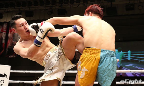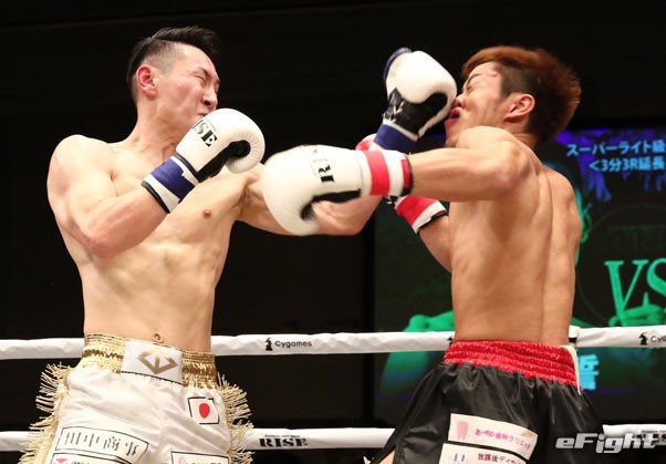 パンチでも蹴りでもKO出来る破壊力を持つ。DEEP☆KICK王者の憂也(右)を破り6戦全勝に