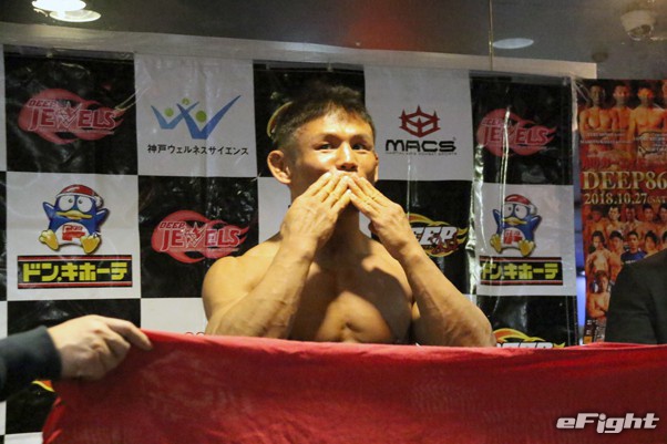 全裸で再計量をクリアーした北岡は、三浦彩佳ばりの投げキッス