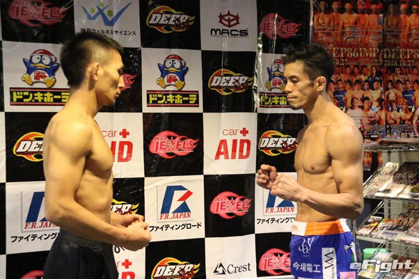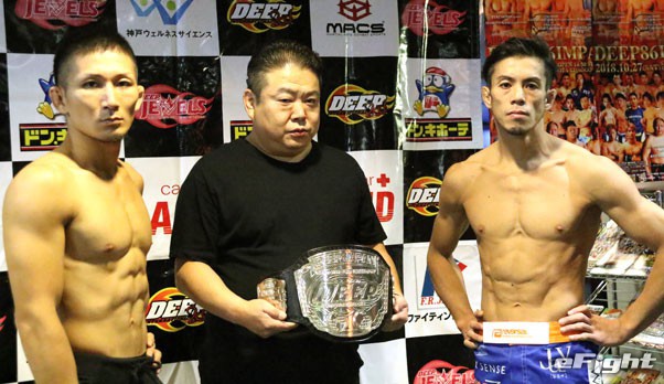 DEEPバンタム級タイトルマッチを争う元谷(左)と釜谷(右)。中央は佐伯繁DEEP代表