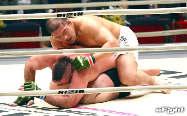 2017年4月のRIZINにて、ヒース・ヒーリングをバックから攻める石井
