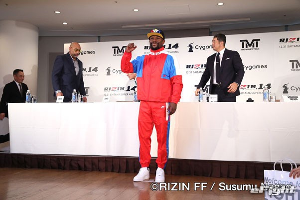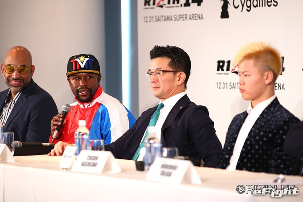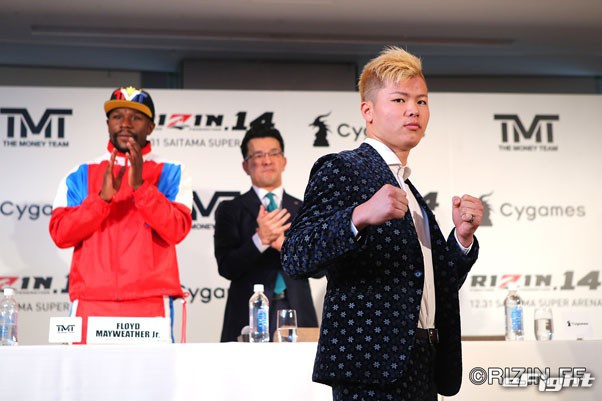 那須川の登場に、立ち上がって拍手で迎えるメイウェザー