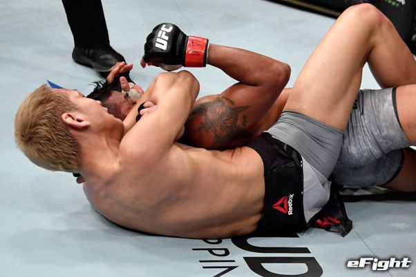 相手の背後からチョークを極める佐々木。6月のシンガポール大会では会心の一本勝ちで、日本人5選手のうち唯一となる勝ち星を挙げた Photo by Jeff Bottari/Zuffa LLC/Zuffa LLC via Getty Images