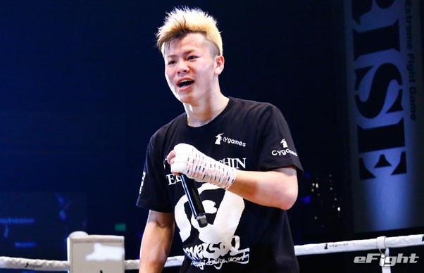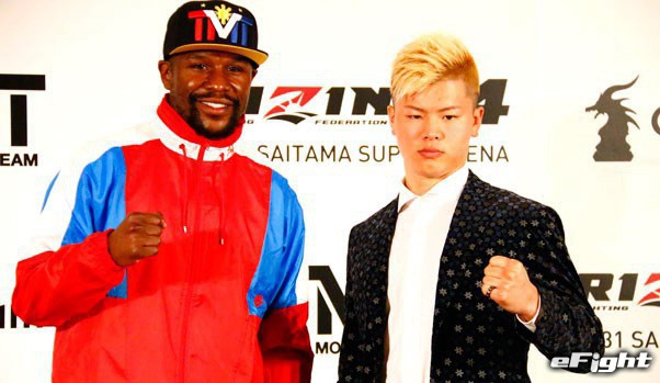 11月5日の記者会見で並ぶ那須川とメイウェザー、身長では8cm、体重では約10kgの差がある。