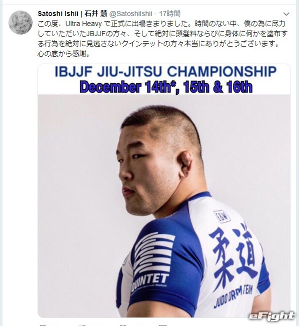 石井は自身のSNSにて柔術黒帯を取得、No-Gi世界選手権にエントリーしたことを報告した