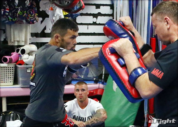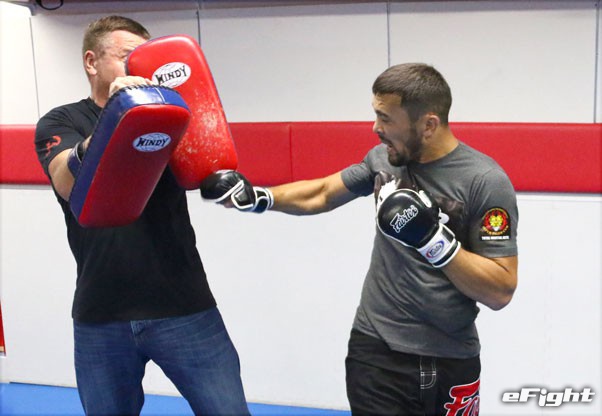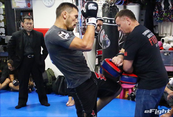 サドゥロエフのミット打ちを頼もしそうに見る田中塾長(左)