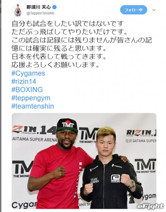 言いたい放題のメイウェザー(左)に、納得のいかない表情を浮かべる那須川(右) PHOTO=(C)RIZIN FF