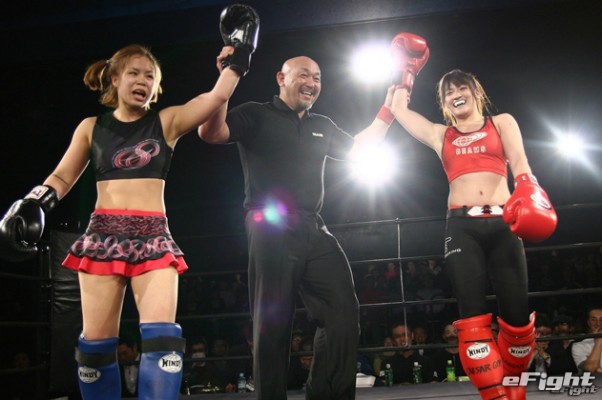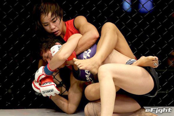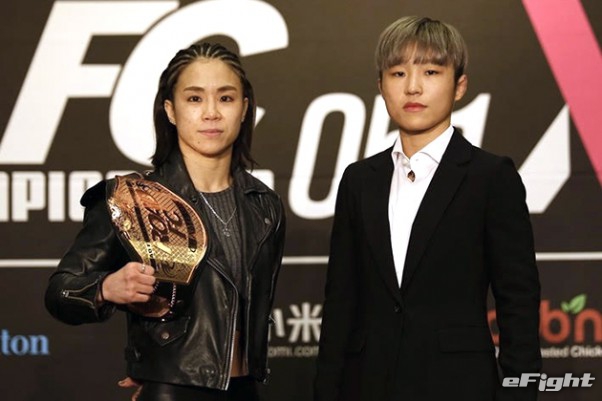 昨年6月のROAD FC女子アトム級王座決定戦で、当時のDEEP JEWELS同級王者・黒部三奈(下)にTKO勝ちしたソヒ(上)
