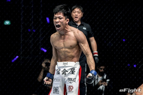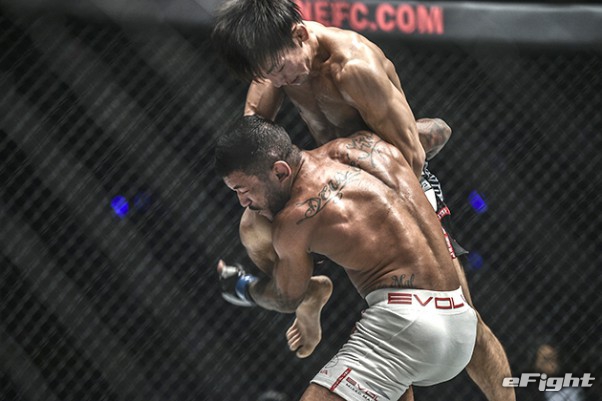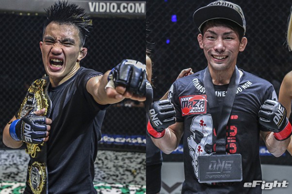準備期間が短い中で臨んだONE初戦で、いきなり元ストロー級王者アレックス・シウバ(下)に完勝した猿田(上)