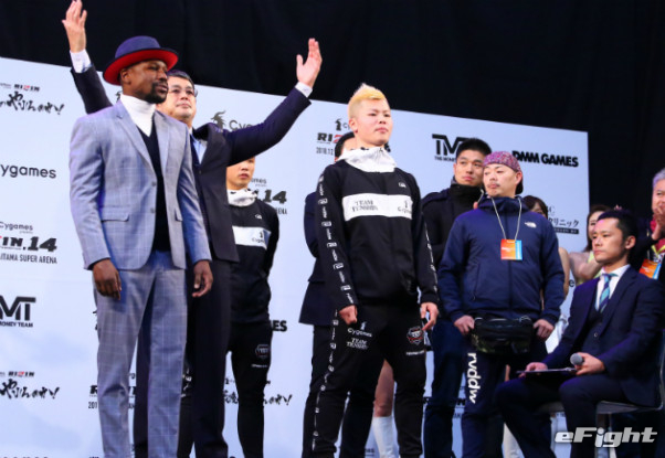前日計量に出席したフロイド・メイウェザー・Jr(左)と那須川天心(右)