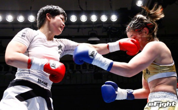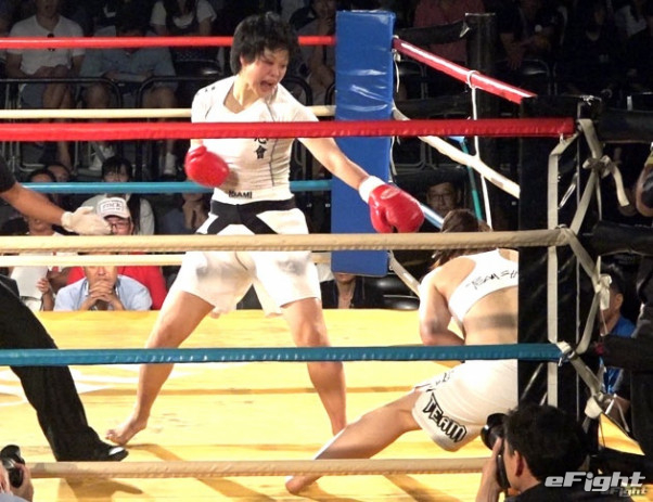 ダウンからのKO勝利で、残身を決めるこまち