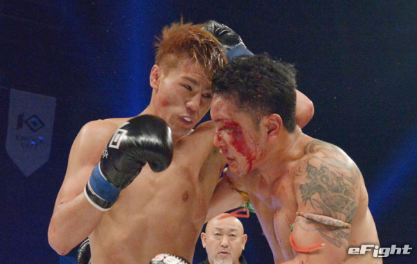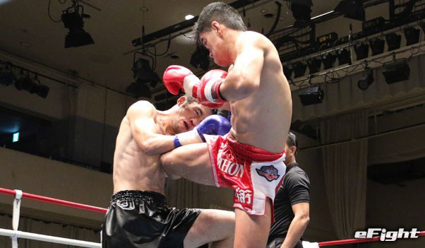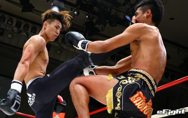 チャムアトーンの顔面に前蹴りを突き刺す海人