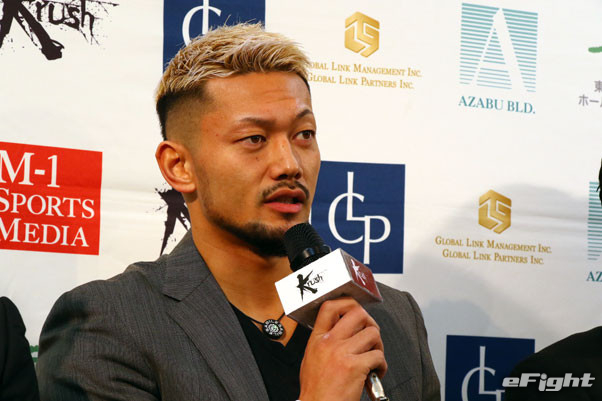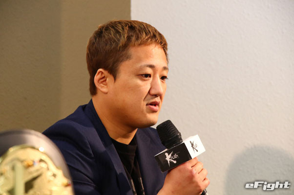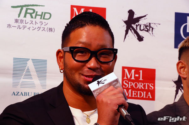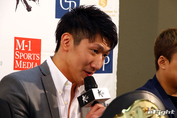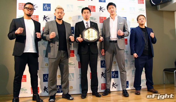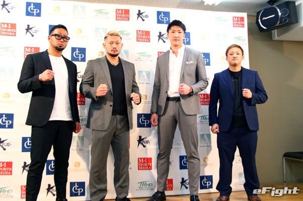 AブロックはK-Jeeと杉本仁が勝ち抜いたトーナメント。Bブロックは(左から)OD・KEN、愛鷹、中村プロデューサーを挟んで、RUI、植村の4名で争われる