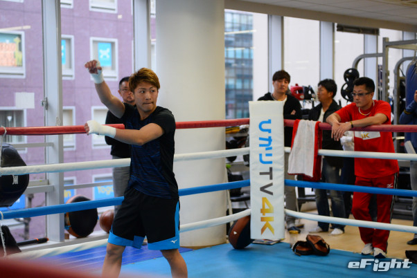 会見後、練習を開始すべく入念にウォーミングアップをする井上尚弥