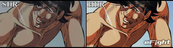 通常のテレビ画像と、ブルーレイの4倍の解像度のHDRを比較すると歴然。