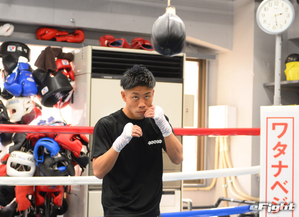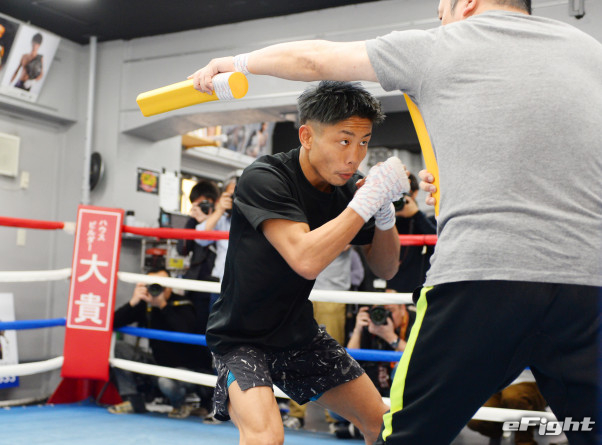 上から吊るしたパンチングボールをよけながらシャドーボクシングをする谷口