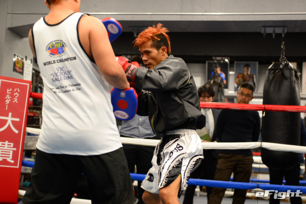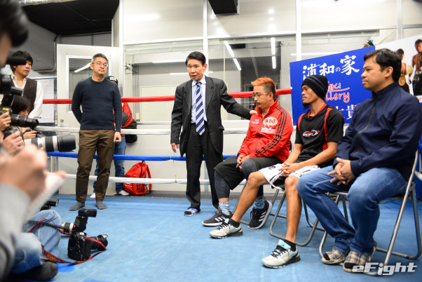 一番右に座るプロモーターがタガログ語を英語に訳し、それをジョー小泉氏(右から4番目)が日本語に訳すというインタビュー形式だった。右から2人目がサルダール