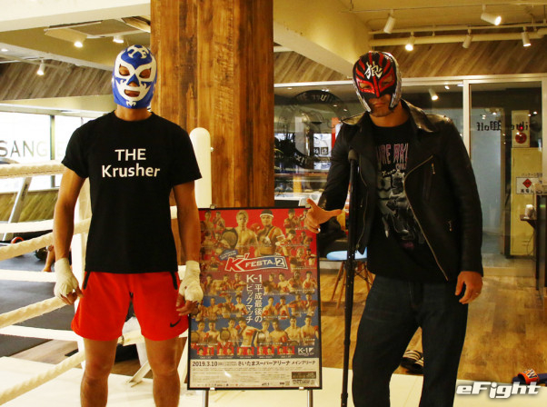 「ザ・クラッシャー」という同ジム某選手の代名詞がプリントされたTシャツを着ている代理人(左)