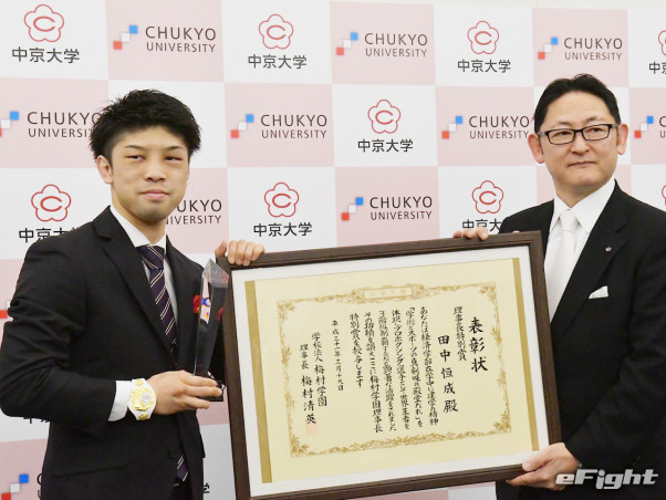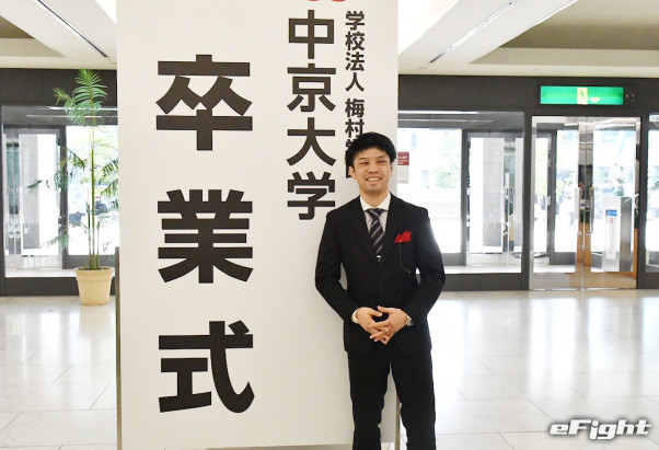 卒業式の看板の前で微笑む田中恒成