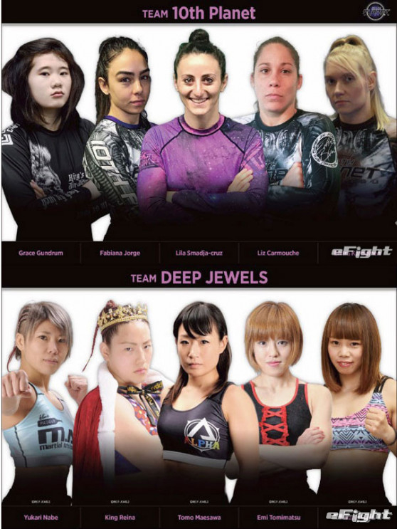 湯浅麗歌子率いる柔術チーム「TEAM BJJ KUNOICHI」(上)と山本美憂率いるレスリングチーム「TEAM Sun Chlorella」(下)が1回戦で激突