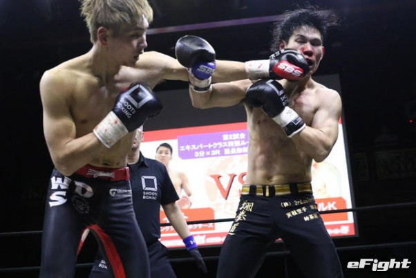 血まみれの相手に、さらにストレートをヒットさせるイモト(左)