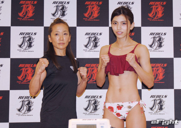Sae(左)とぱんちゃんが計量をパスしファイティングポーズをとる