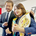 WBO世界女子スーパーフライ級王座決定戦に臨む吉田実代。手には対戦相手・モートンの写真