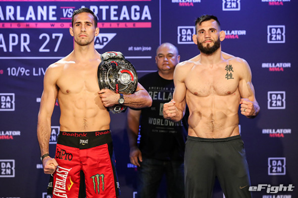 ウェルター級ワールドグランプリの準々決勝と同級タイトルマッチを兼ねたメインイベントで激突する王者マクドナルド(左)と挑戦者フィッチ(右)
