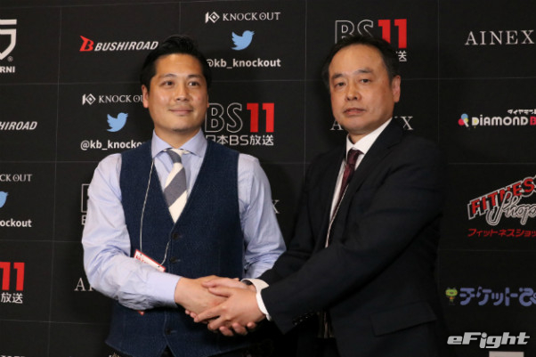 小野寺プロデューサー(左)とキックスロードの原田克彦代表(右)