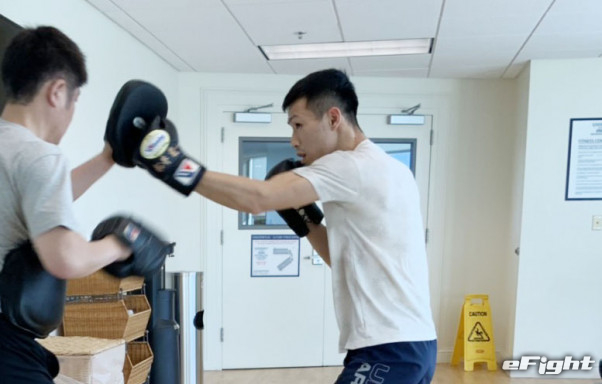 アメリカに到着し、高橋トレーナーの持つミットに打ち込む船井