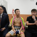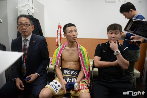 昨年11月に行われたオリボとの挑戦者決定戦で2RTKO勝ちし、控え室で王者への意気込みを語る船井